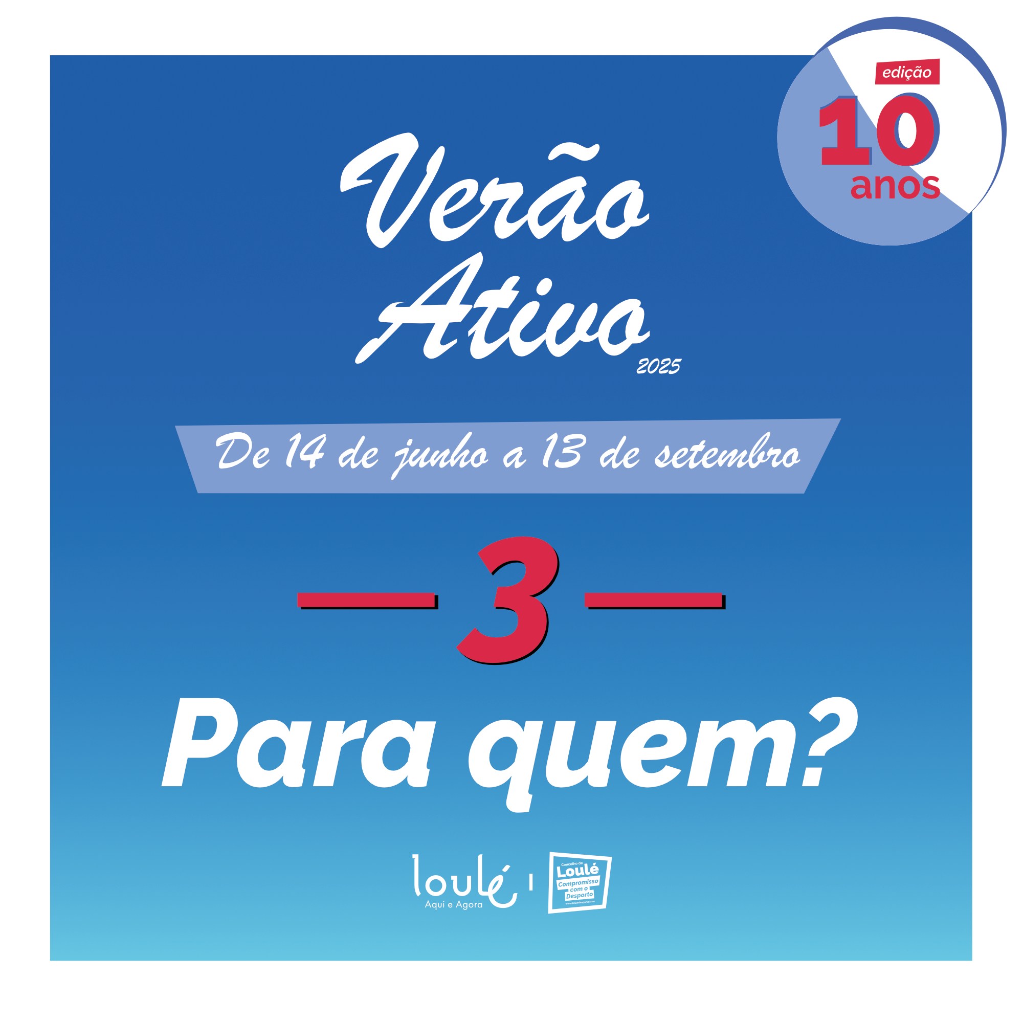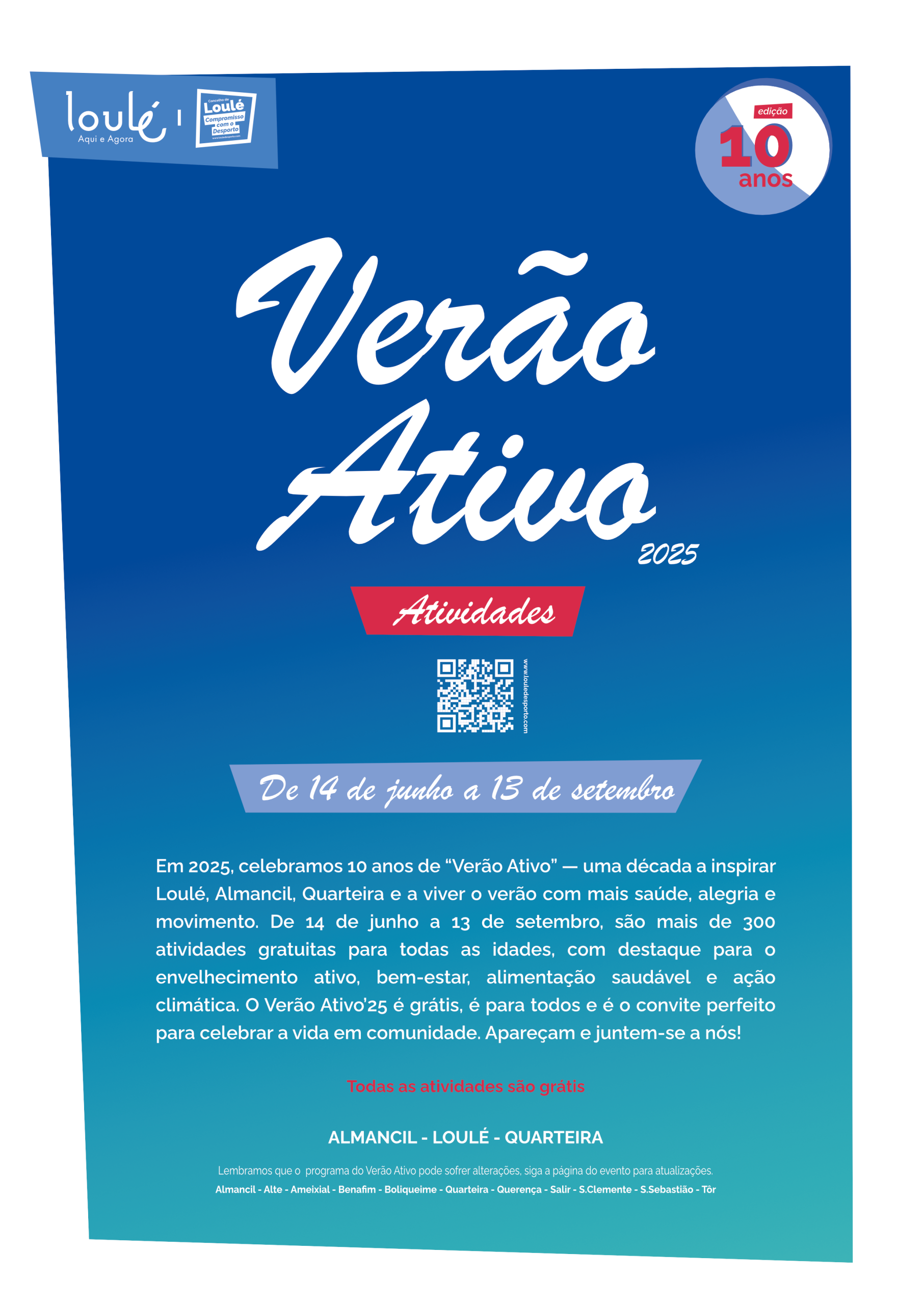 Este ano, de 14 de junho a 13 de setembro, o “Verão Ativo’25” decorre em Loulé, Almancil e Quarteira, com um programa ainda mais alargado e diversificado, que inclui 300 aulas e/ou atividades gratuitas. Para assinalar esta edição comemorativa, o programa terá um enfoque especial no envelhecimento ativo, no âmbito do projeto europeu “One Health 4 Cities”, com atividades pensadas para promover a saúde física, mental e social da população sénior — sempre num ambiente de inclusão, segurança e boa disposição.